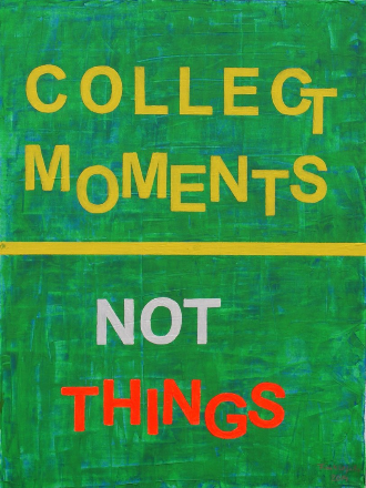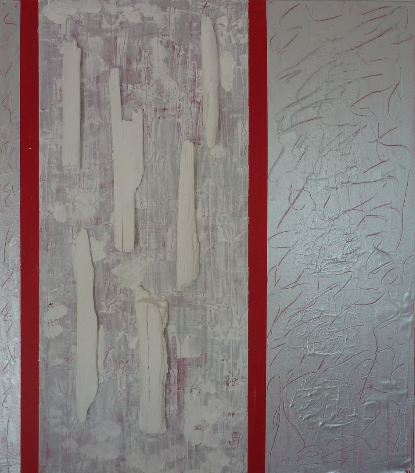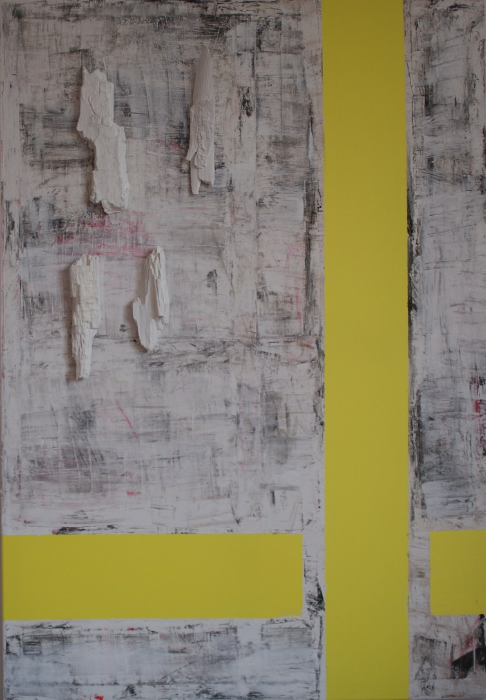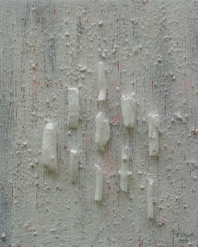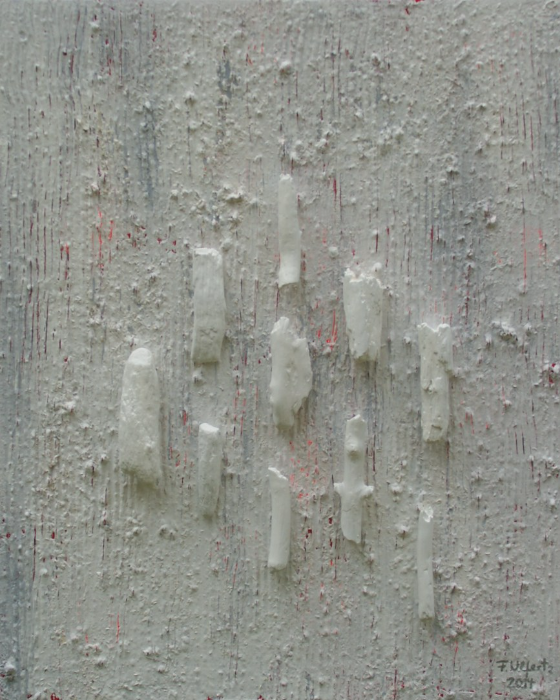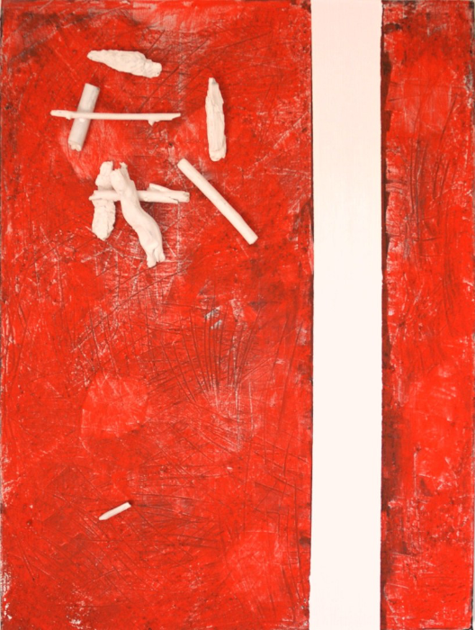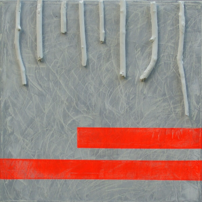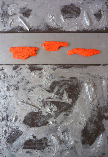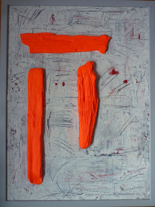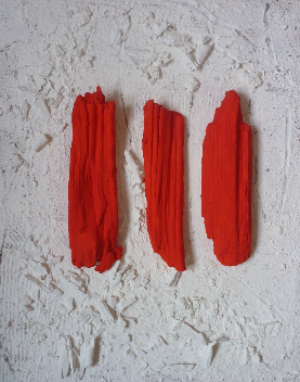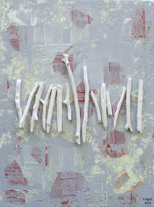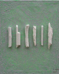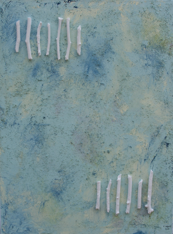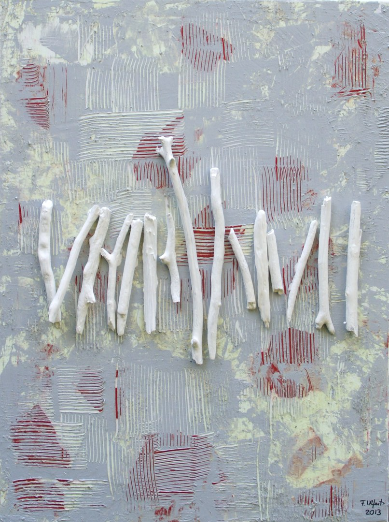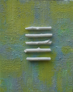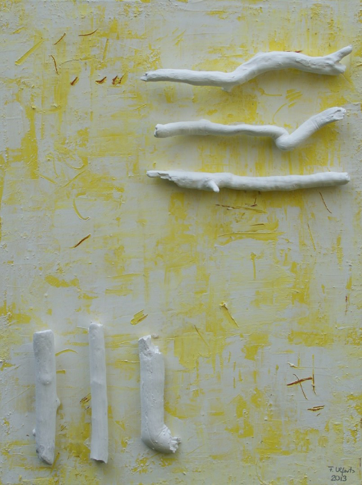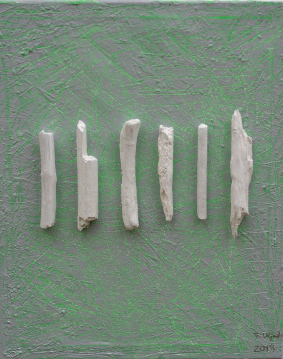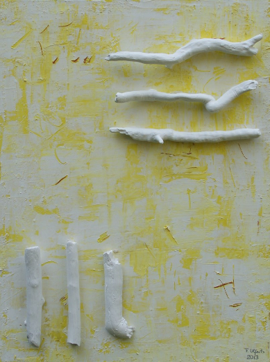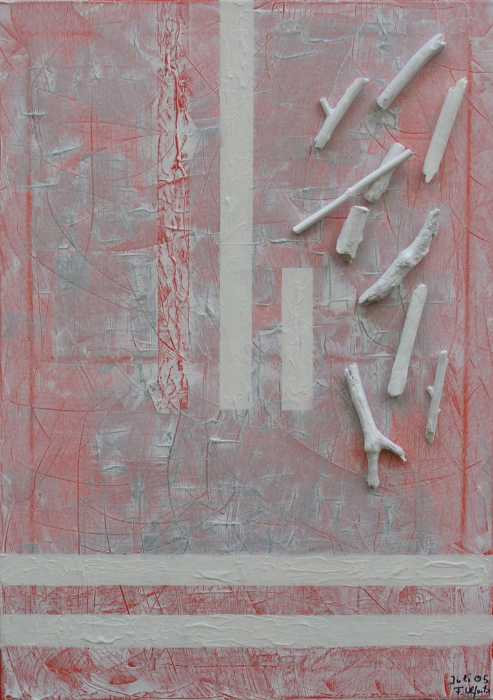 Acrylfarbe mit Sägemehl und kleine Holzstücke auf Leinwand mit drei Hölzer (Isar-Treibgut)